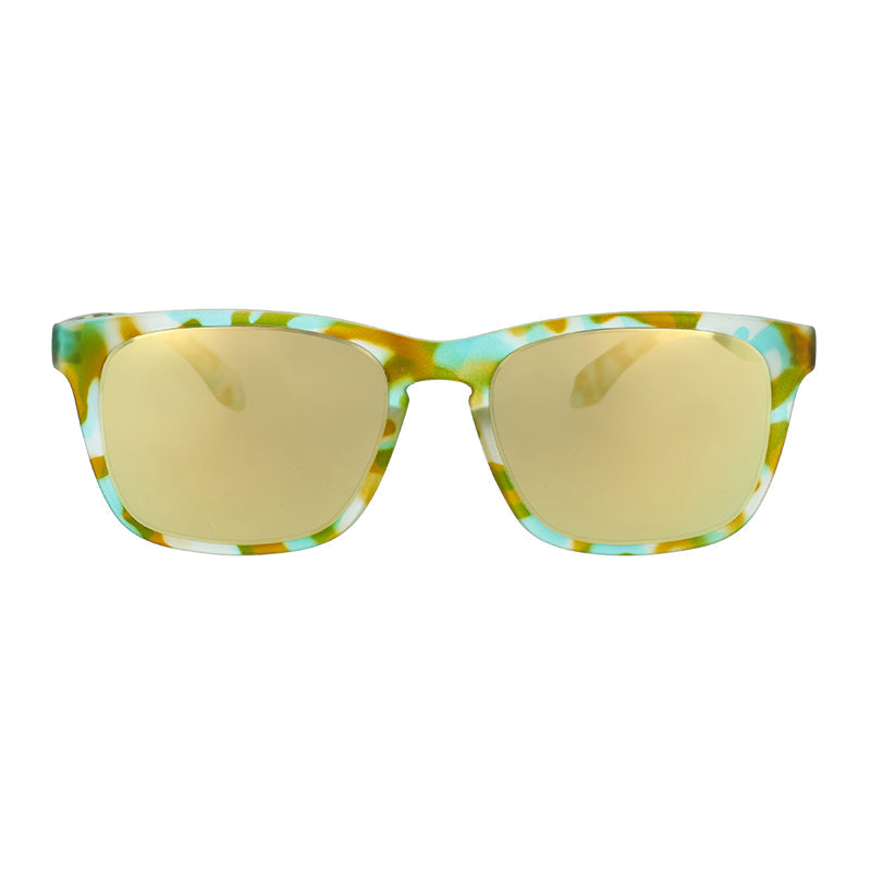 Unisex sport sunglasses with jungle camo frame and gold mirrored lenses.