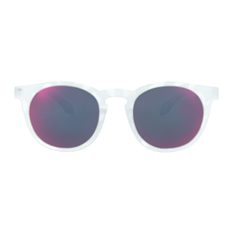 Unisex fashion sunglasses with white camo frame and red-black mirror lenses.