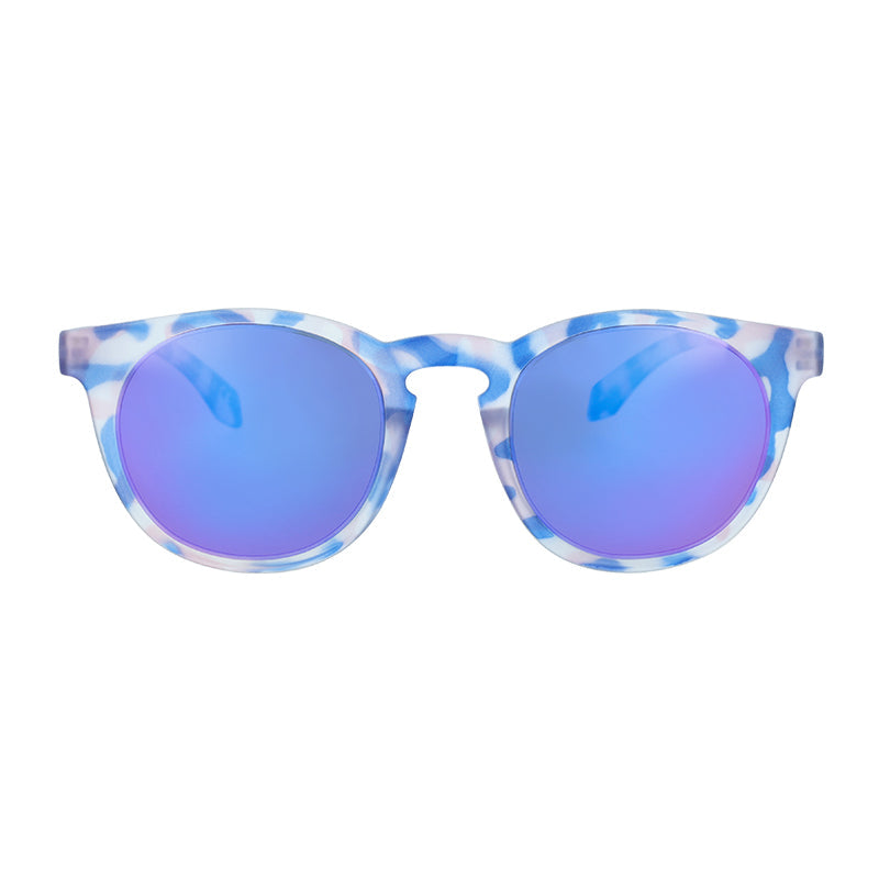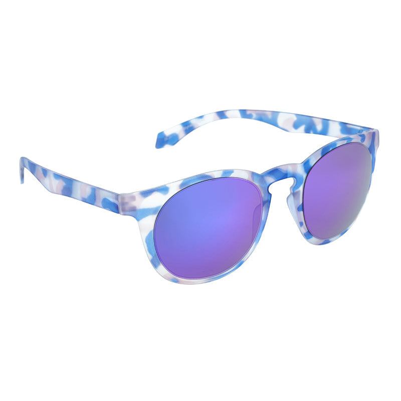 Unisex fashion sunglasses with blue camo frame and blue mirrored lenses.