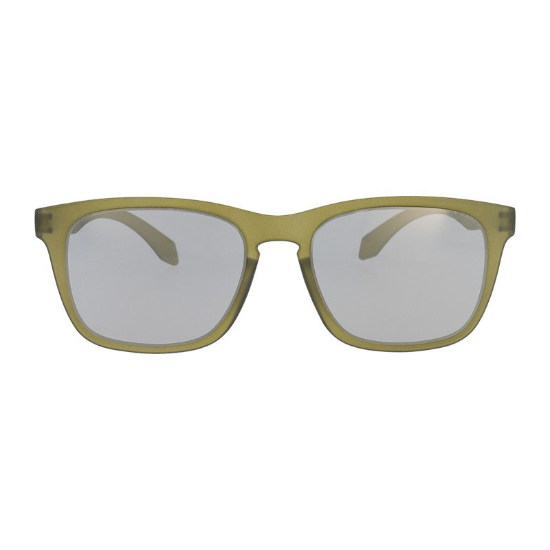 Unisex sport sunglasses with green transparent frame and grey lenses with a gold mirror coating.