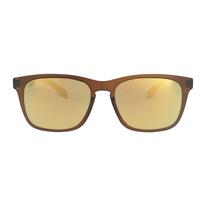 Unisex sport sunglasses with bronze transparent frame and brown lenses with a gold multilayer mirror coating.