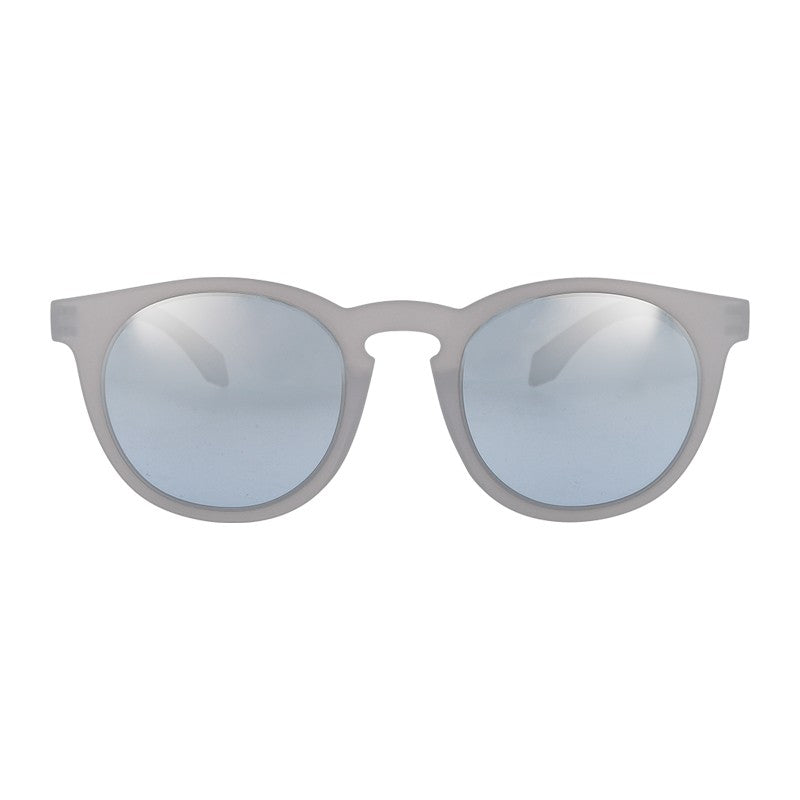 Unisex fashion sunglasses with light grey transparent frame and blue lenses with a silver mirror coating.